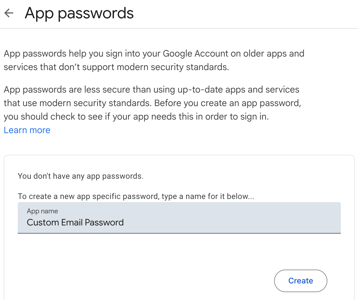2. On the App passwords page, type a label such as “Custom Email Password.”
