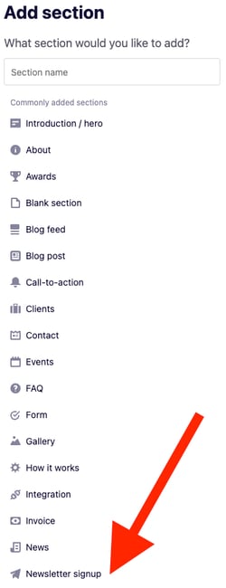 2. Select the page where you want to add your newsletter signup section, then click Add section
