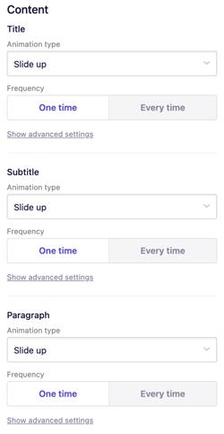 For each element, select the animation type and frequency (one time or every time the section appears).