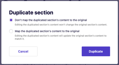 If you select Map the duplicated section's content to the original, any changes made to one of the sections' content will be made to the other one automatically.