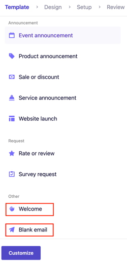 3. Under Template, scroll down and select Welcome email or Blank email, then click Customize.