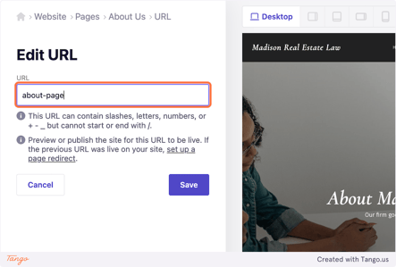 4. Type in your new URL. You can use letters, numbers, slashes, and the characters + - _, but the URL cannot begin or end with a slash.