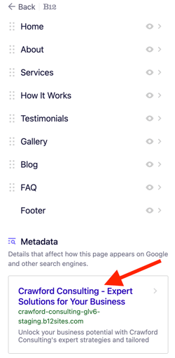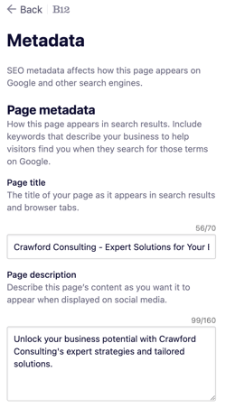Website metadata is used only when a page does not have its own metadata. Since most B12 pages include their own page level metadata, these website metadata settings are usually not shown unless needed.