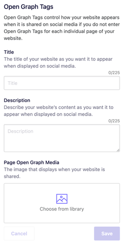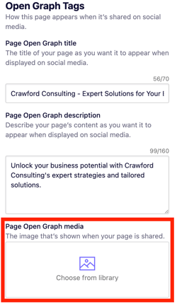 5. Enter your OG title and description. Then set your page OG media by clicking Choose from library and selecting the image you want to appear in link previews.