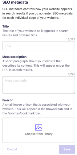 3. Enter a site Title and site Description. Then set your site's favicon by clicking Choose from library. Select the image you want to appear as your browser tab icon.