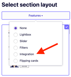 Important: Your section layout must support integrations to display them on your site. You may need to change your section layout or add a new section before following these steps. When selecting a layout, use the Features dropdown to view layouts that support integrations.