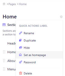 2. Click the ⚙ gear icon next to the page's name, and click Set as homepage.