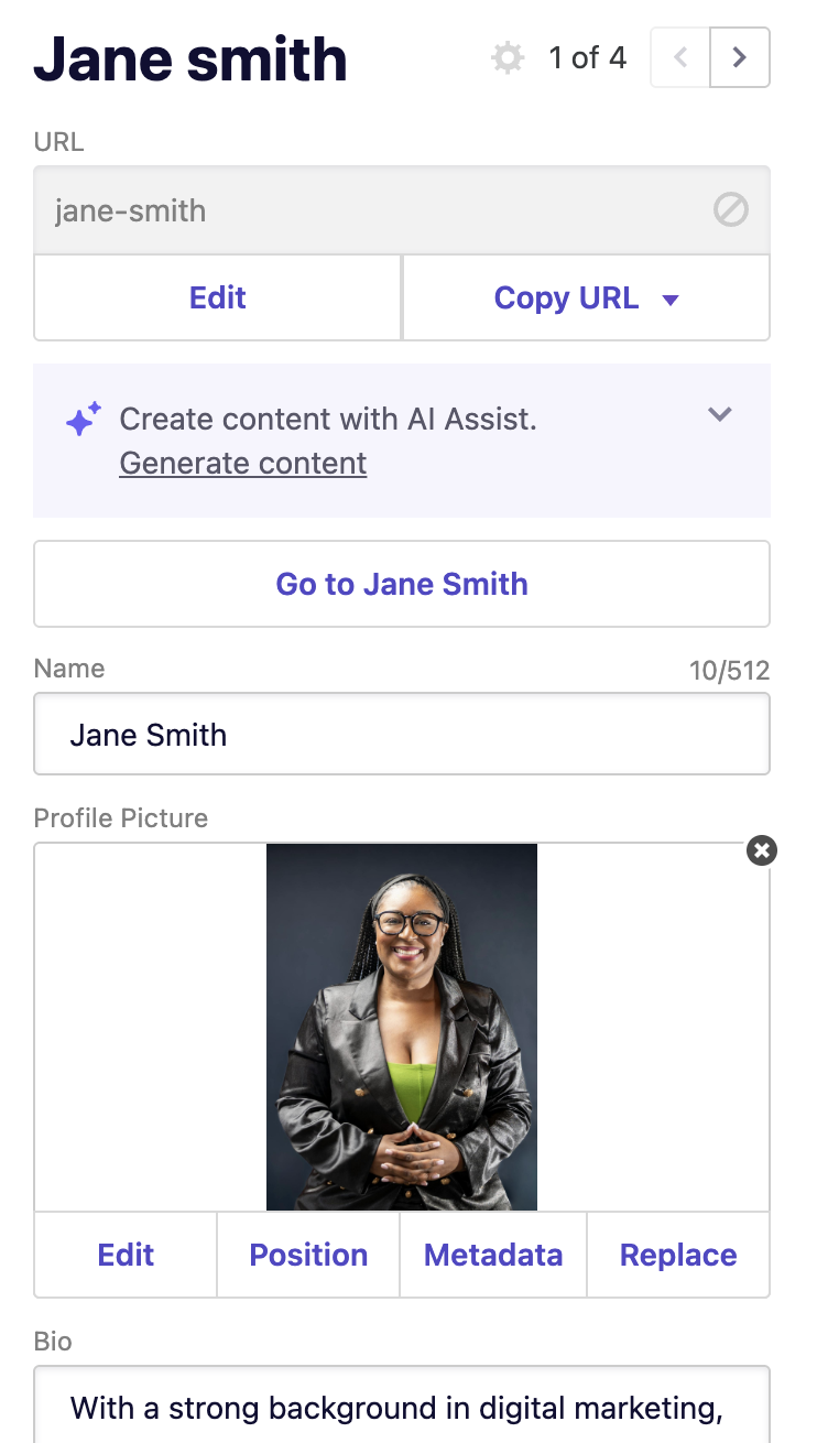 - From there, you can edit their name, bio, bio summary, and job title as well as upload a headshot