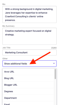 - Bio Summary: This is a shorter bio or introduction that can be displayed in full in your team section. If you leave this field blank, your team section will usually display a limited preview of the biofield.