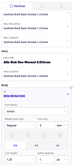 3. To edit your website’s fonts for mobile and tablet views, click the device icons above the font settings to switch between desktop, tablet, and mobile.