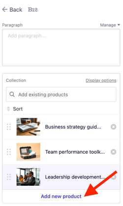 Note: The wording changes depending on the section type. For example, you may see Add new product, Add new resource, or Add new service.