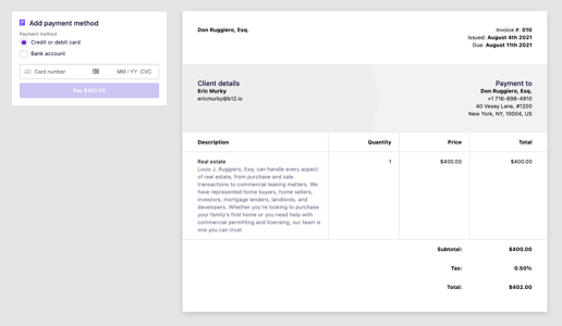 Send professional, branded invoices to your clients from your B12 account. They will receive the invoice in an email and can pay with a card or bank transfer. There are no extra costs aside from standard transaction fees, and it's a no-brainer switch if you're using a third party with outdated designs or monthly fees. As a bonus, keeping Online Payments in B12 means you have one less platform to manage.