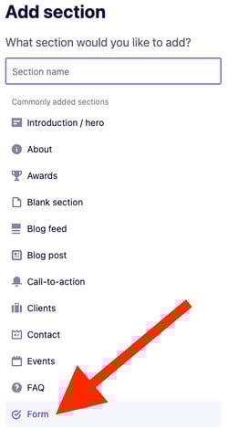 If you want to add a Contact form to an existing page, you can do that by adding a new section.