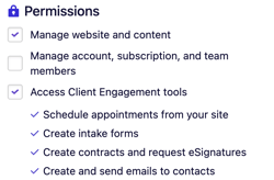 Unless they also have Admin or Clients permissions, team members with Website permissions cannot: