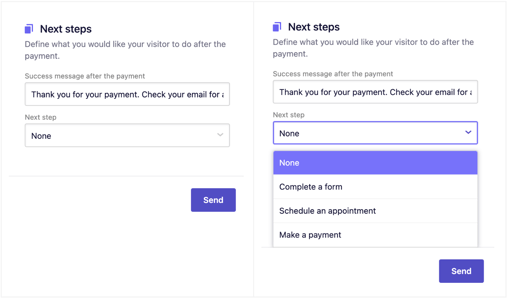 Next steps functionality helps you customize and control what happens after your client performs an action on your site, such as making a payment or submitting a form.