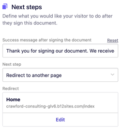 5. Under Next Steps, confirm what the visitor should see or do after signing the document with eSignature.