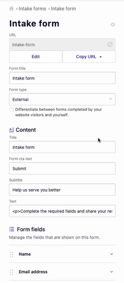 Note: We recommend you edit the form’s URL, Form title, Title, and Text to be relevant to the AI form’s purpose. For example, if the AI form will generate a job posting, change the URL to “generate-job-post”, the Form title to “Job post generator”, the title to “Job post generator”, and the text to “Complete the fields to generate a job post”.