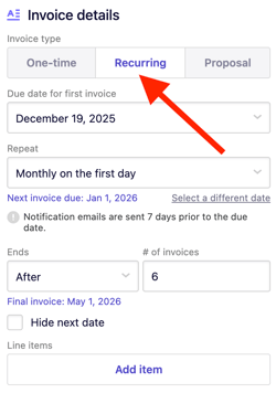 5. Choose the due date for the first invoice, how often invoices repeat, and when they should stop.