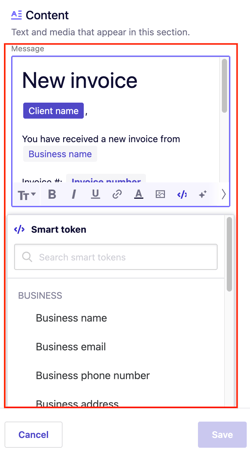 These purple fields are smart tokens, which automatically pull in details like the client’s name, invoice number, or due date.