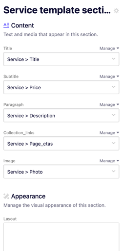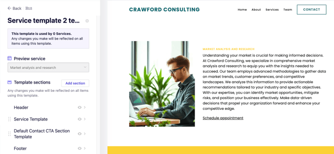 4. A preview of your Service page template will appear. To customize its appearance, edit the individual sections—such as the Service Hero Template or Service Template sections.