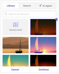 Upload media. Select your image, then clickContinue. All uploaded files are stored in your Library for future use. ClickSaveto update.
