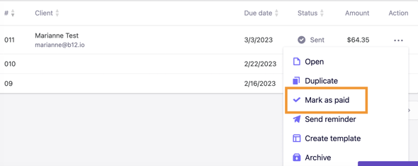 If you sent a client an invoice from your B12 account but they paid you with an external method (e.g., cash, check), you'll want to mark their invoice as paid to keep your books in order and to prevent them from receiving payment reminder emails.