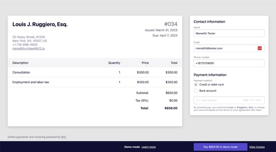 Fortunately, B12 has a feature that lets you simulate paying an invoice in 'demo mode' without entering a payment method, such as a credit card or an ACH bank transfer. Don't worry, your clients will not be able to access 'demo mode.'