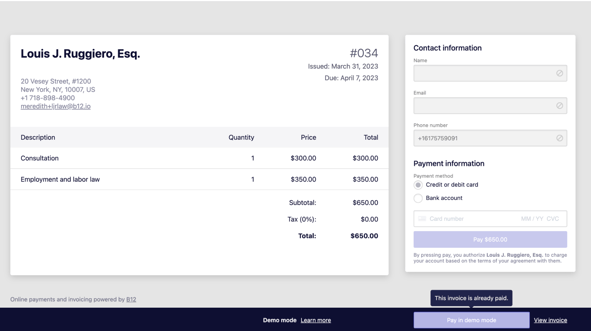 Pay in demo modebutton, you will see what clients would ideally see (a way to enter payment information), and hopefully that will convince you to connect your bank account details to the B12 invoicing tool so you can accept payments online.
